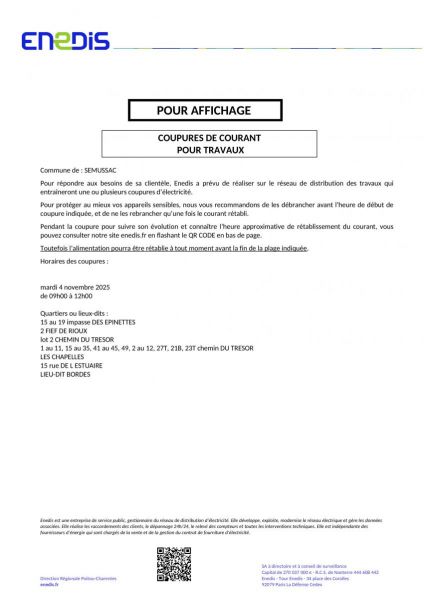 Coupure de courant le mardi 4 novembre 2025 de 09h00 à 12h00