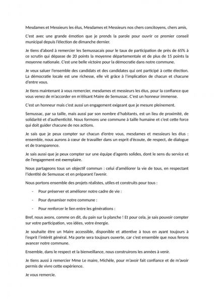 Ghislaine Guillen élue maire de Semussac par le nouveau conseil municipal ( 23 conseillers) ce vendredi 20 mars 2026 . Elle succède à Michèle Carré maire de la commune depuis 18 ans.
